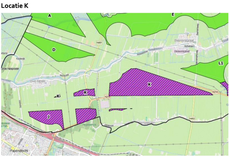 Eén van de 6 voorlopige locaties betreft vlak K. Tot onze verbazing, ongenoegen en ontsteltenis loopt deze grootste locatie dwars door het groene, historische lint naast de Abbekesdoel; een gebied dat tot voor kort streng werd toegezien op behoud van aanzicht, natuur en bebouwing.